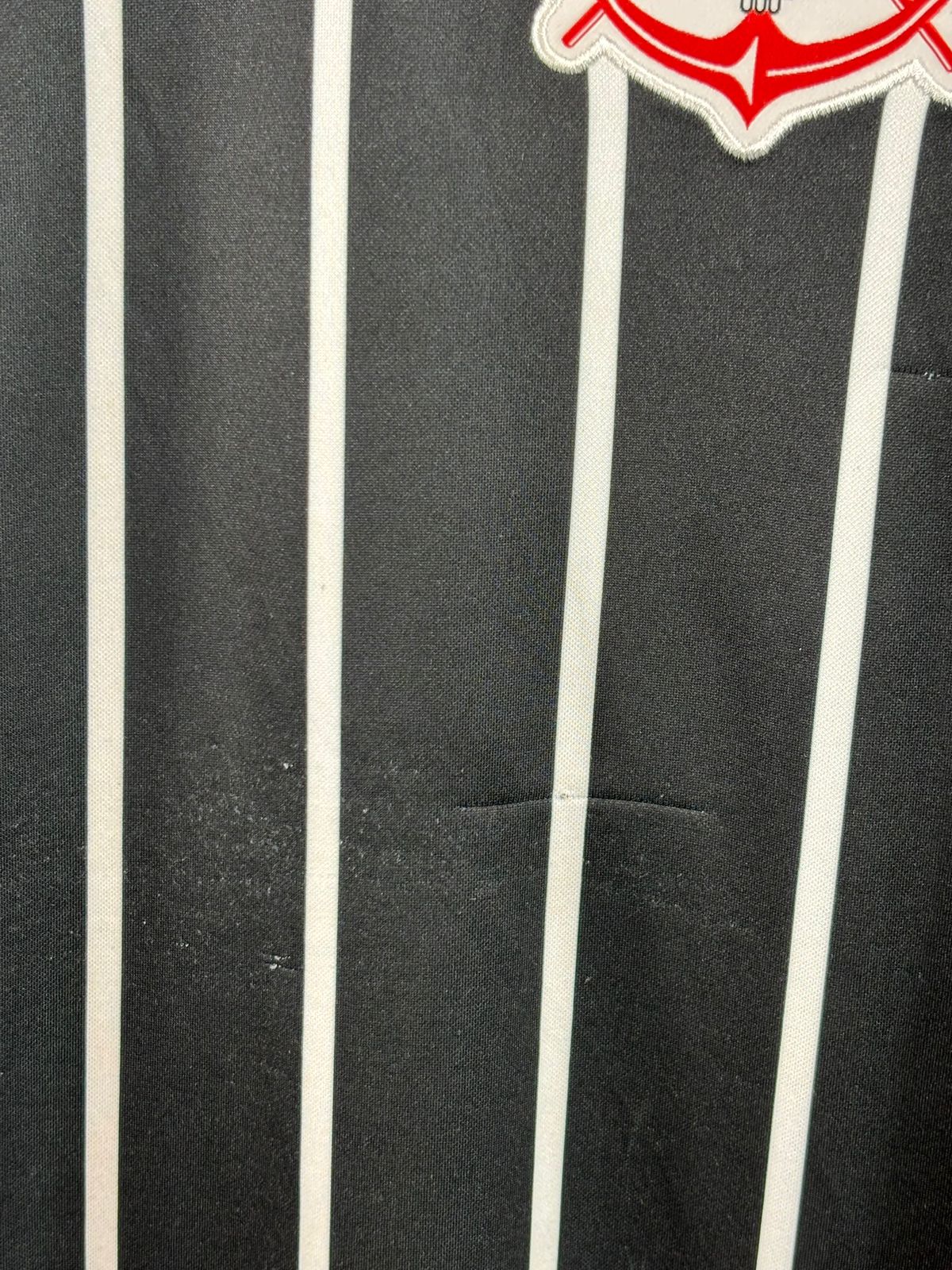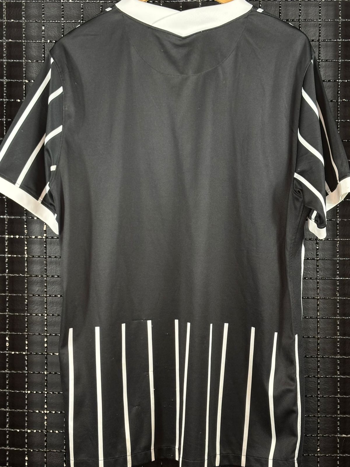 Camisa em estado regular com fio puxado e bolinhas, tamanho GG, medidas 58×81 cm.