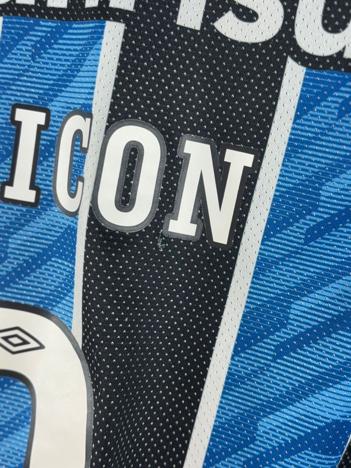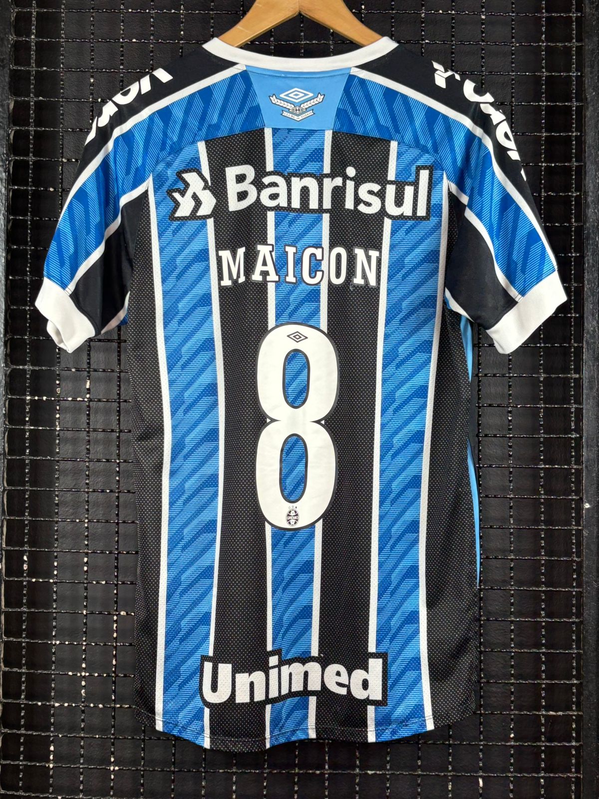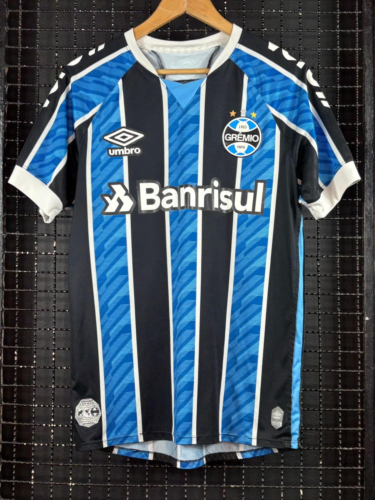 Camisa em bom estado com pequeno furo abaixo do nome, tamanho M, medidas 53×74 cm.