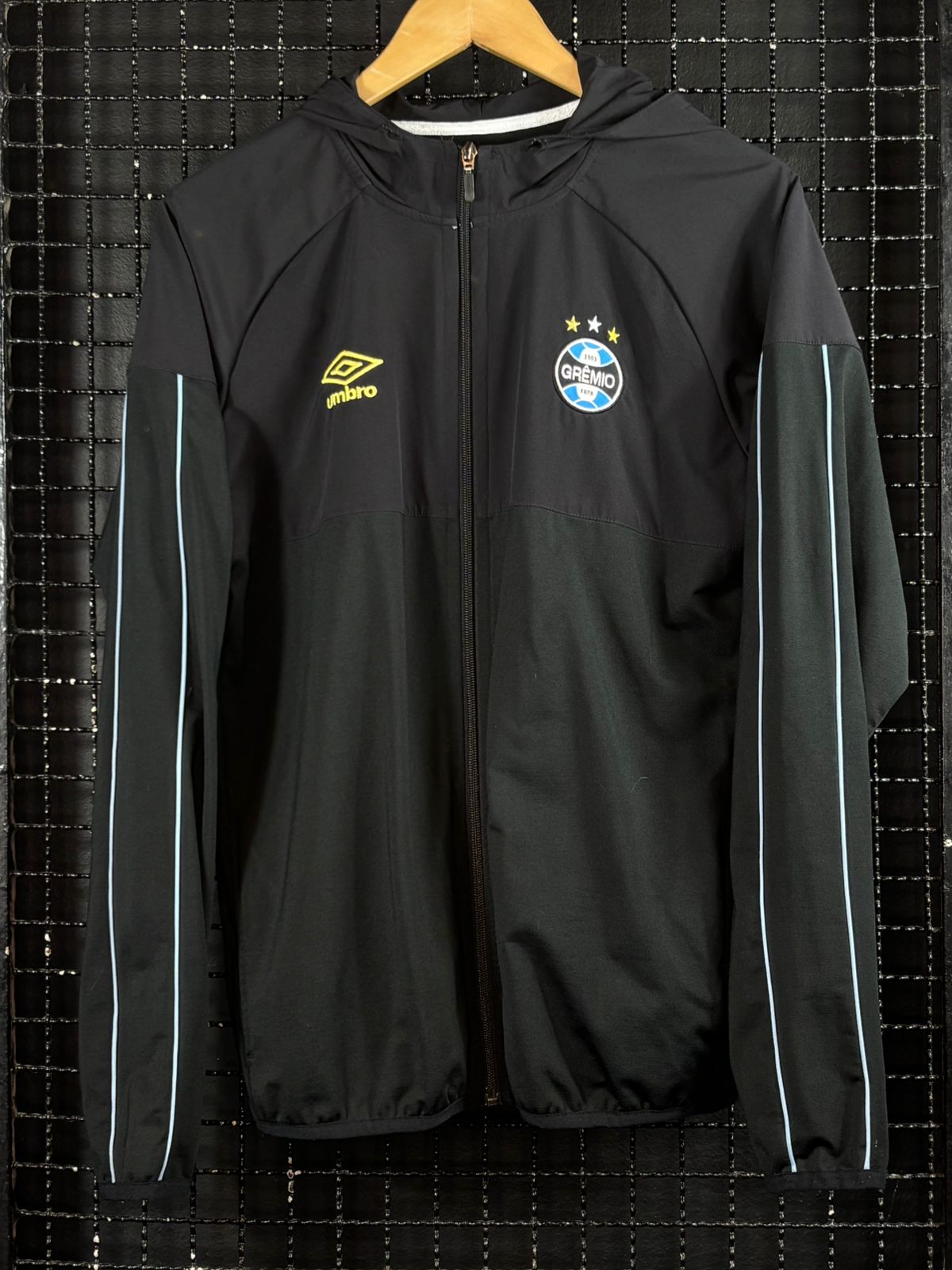 Jaqueta em perfeito estado com dois bolsos e capuz, tamanho P, medidas 52×71 cm.